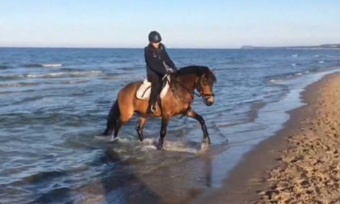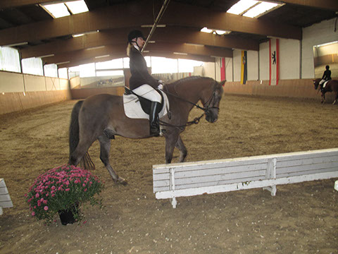 So kam er im Juni 2012 zu seiner neuen Besitzerin. Vom Schulpony zum Hennigsattel und vom Pony zum Herzenspony! Am Anfang war es für die junge Reiterin nicht leicht und sie war so manchesmal am verzweifeln, wenn Chrunchy sie über den Hof geschliffen hat, sich losriss oder gar nicht mehr gelaufen ist. Losrennen war eine seiner Lieblingsbeschäftigungen! Aber Beide haben zusammen gfunden. Die Reiterin hat reiten gelernt und "Chrunchy Nut" hat Vertrauen gelernt.Heute ist er bis L-Dressur ausgebildet, geht Military oder einfach nur mit Halsring baden. "Crunchy" hat mit seiner Reiterin den 6er im Lotto gewonnen und wir wünschen den Beiden weiterhin von Herzen alles Gute!